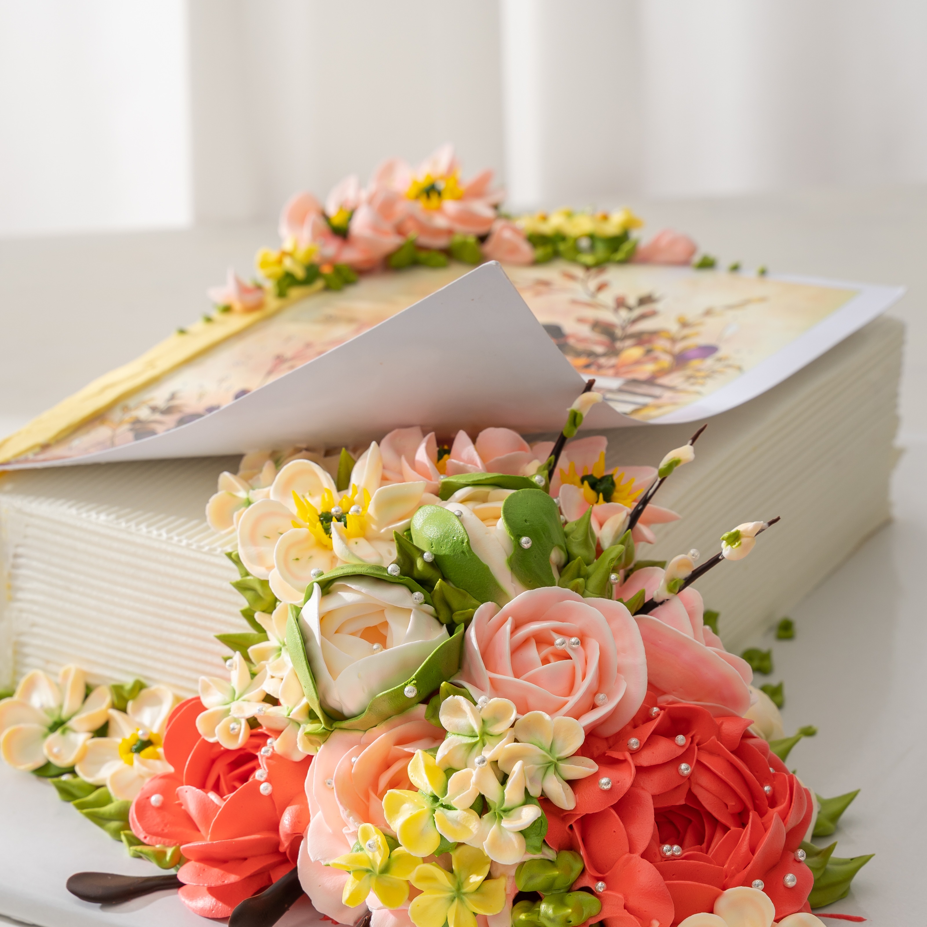 Cốt bánh mềm xốp, kem tươi thanh nhẹ, vị ngọt hài hòa. Có thể thay đổi nội dung in và lời chúc theo yêu cầu.