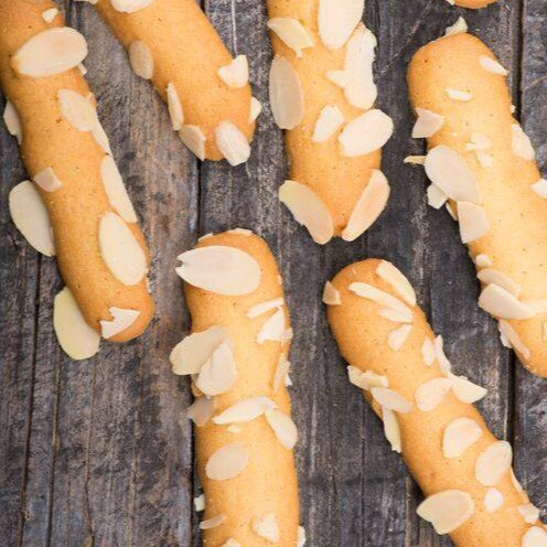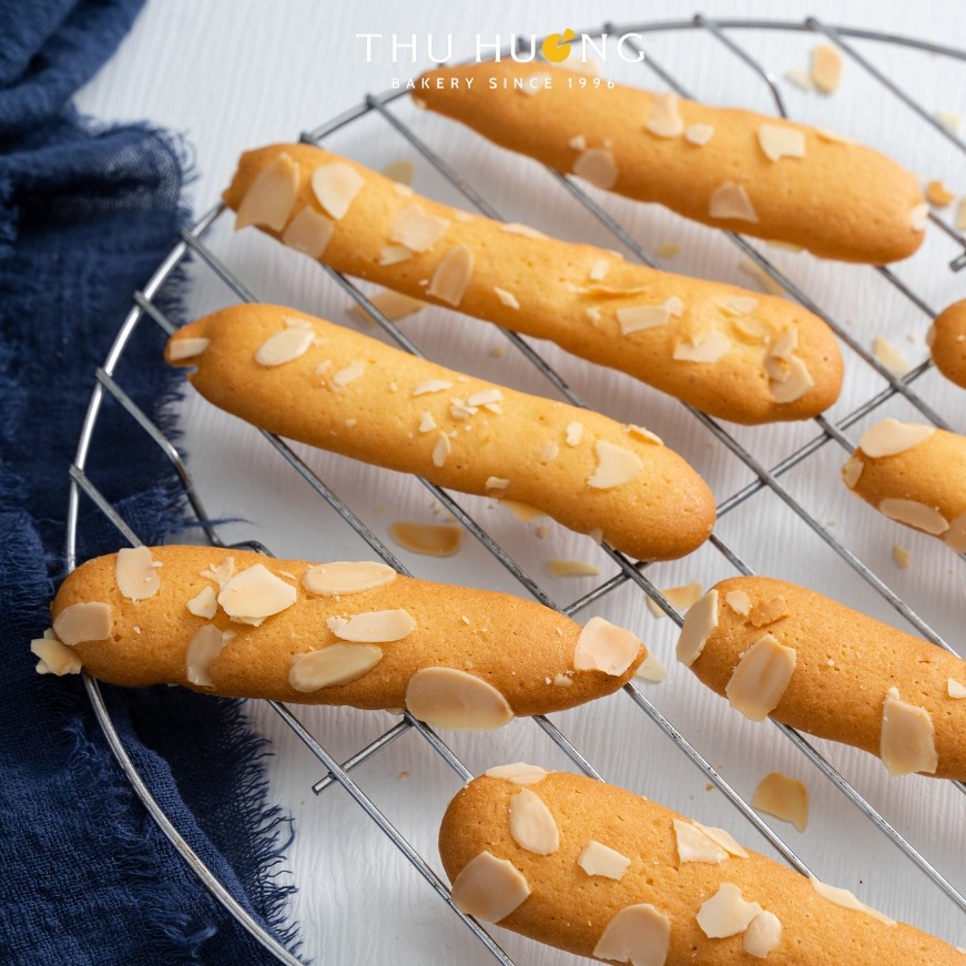 Lớp bánh vàng ươm kết hợp hạnh nhân lát bùi bùi, tạo nên hương vị hài hòa, không quá ngọt. Mỗi chiếc bánh mang đến cảm giác giòn tan, thích hợp dùng kèm trà hoặc cà phê.