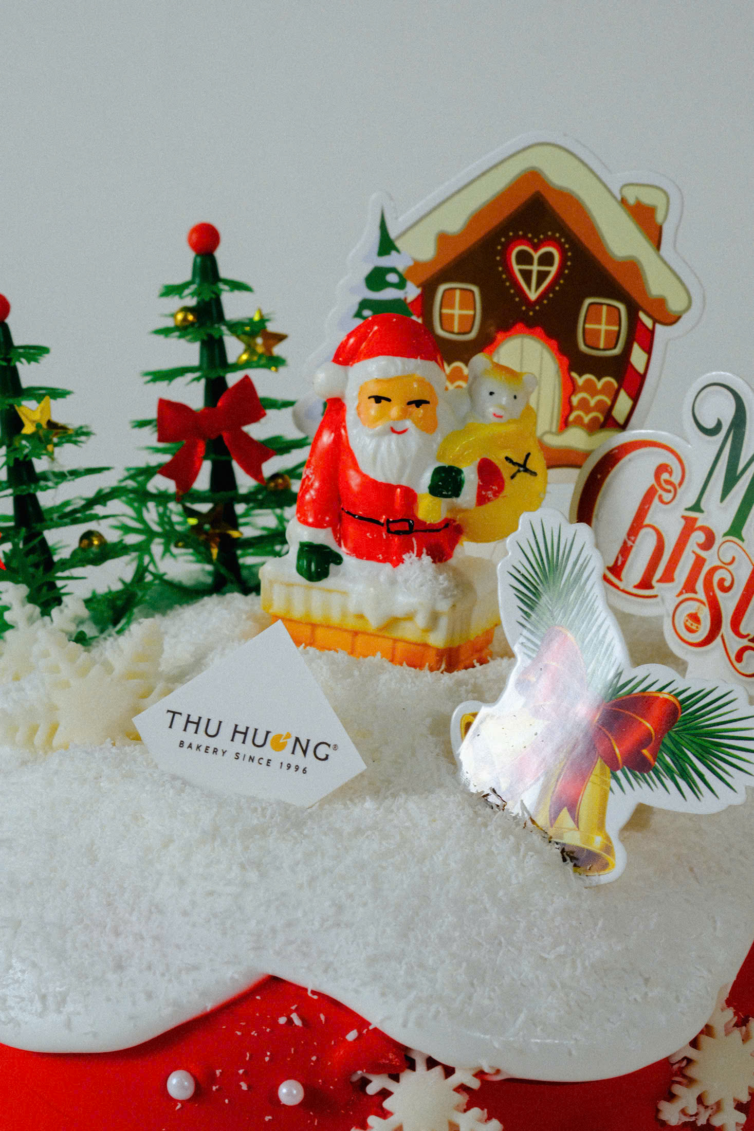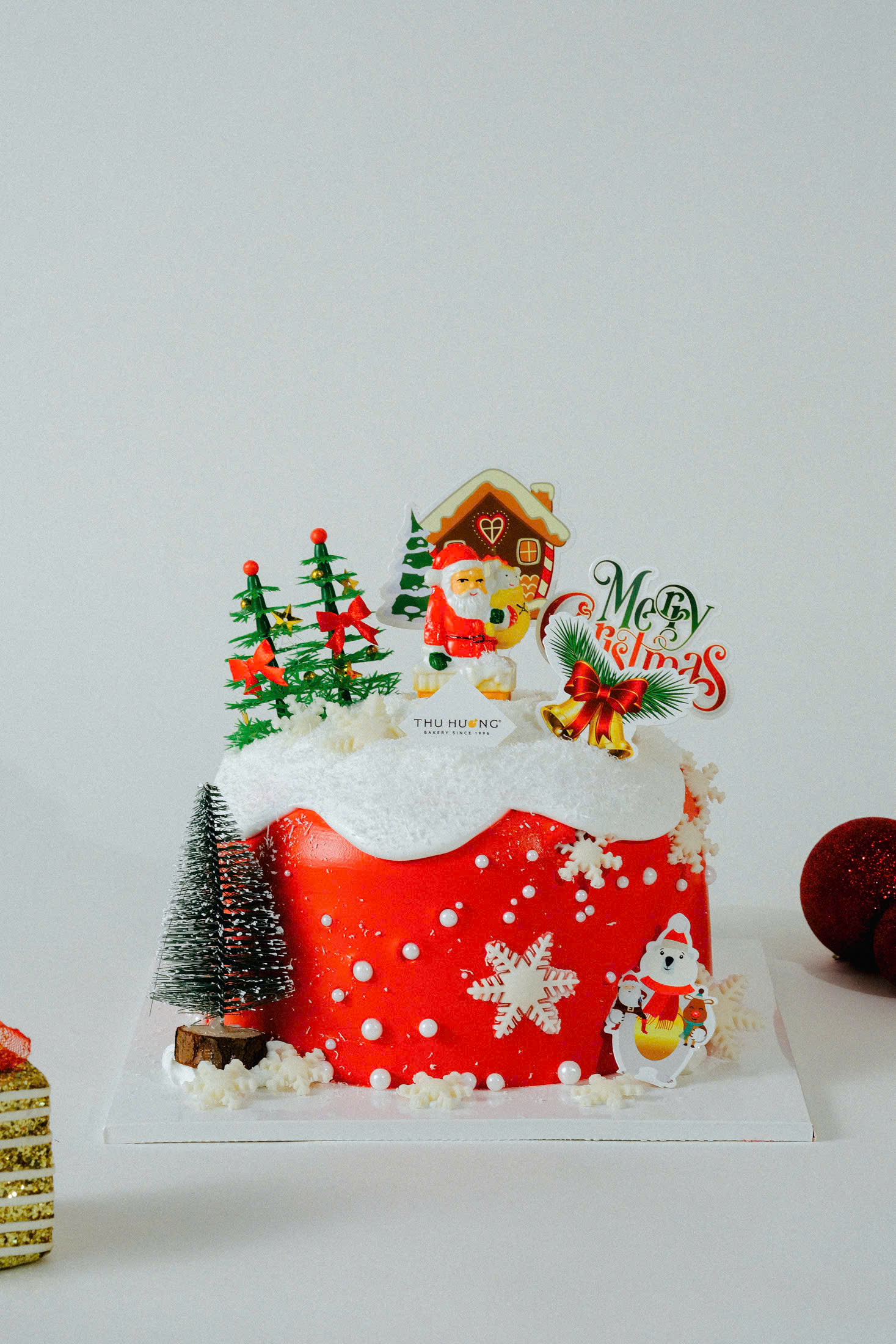 Santa Christmas Cake mang sắc đỏ nổi bật của mùa lễ hội, kết hợp cùng tạo hình ông già Noel, cây thông và khung cảnh tuyết phủ sinh động. Bánh được trang trí thủ công tỉ mỉ, lớp kem mịn nhẹ cùng cốt bánh mềm xốp, tạo nên hương vị hài hòa và hình thức bắt mắt – hoàn hảo cho những buổi tiệc Giáng Sinh ấm áp.