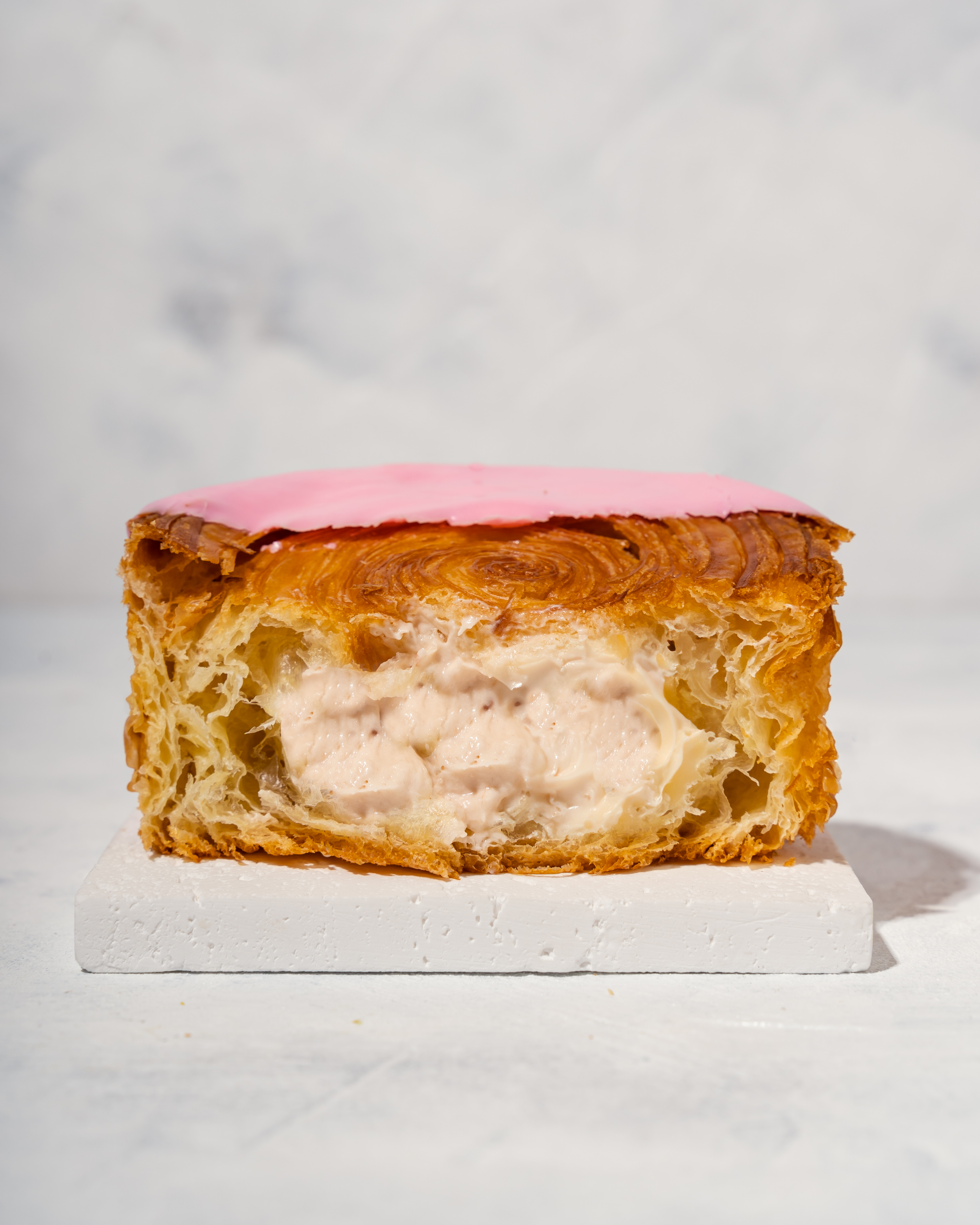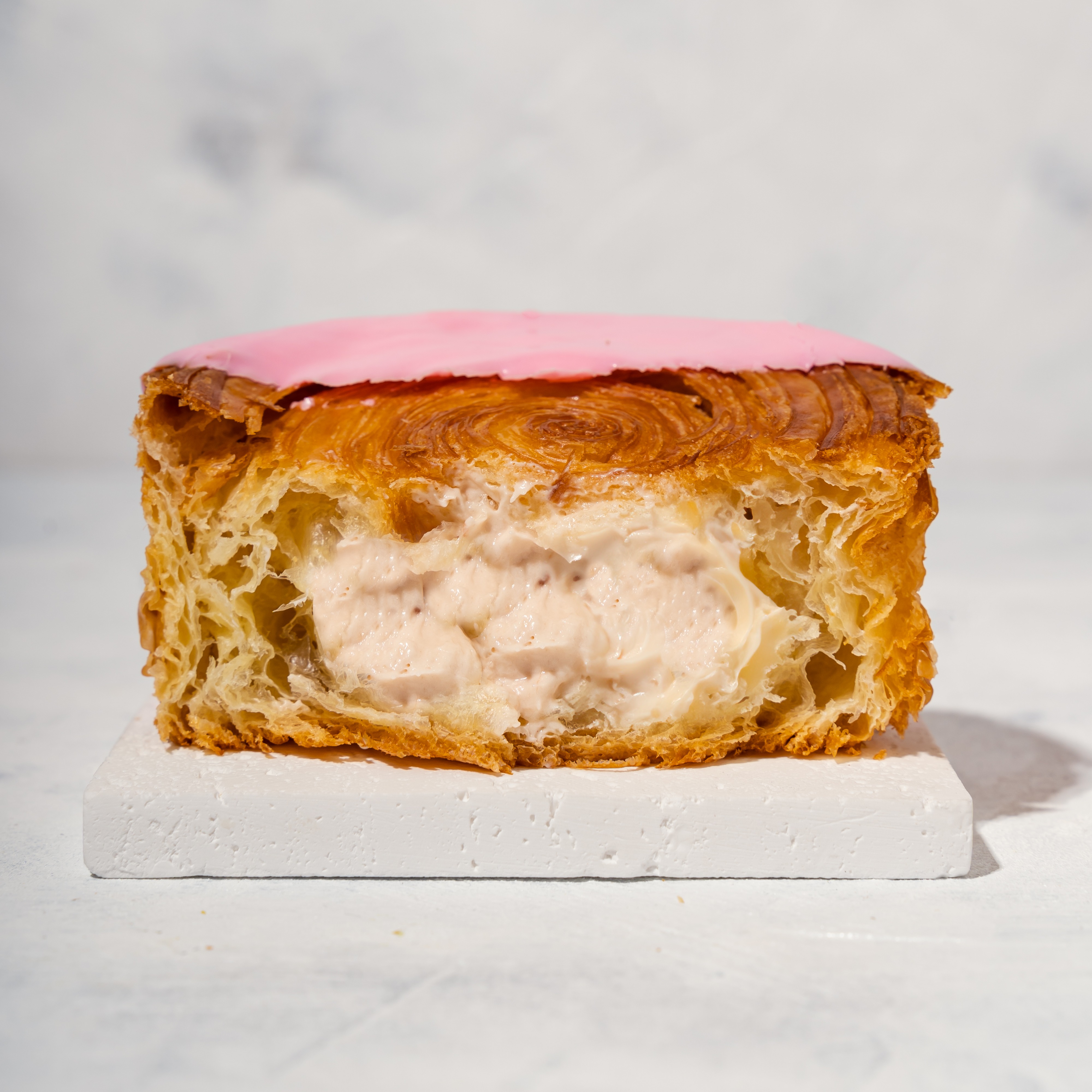 Bên trong là nhân kem sữa hòa quyện cùng vị dâu chua ngọt dịu, tạo cảm giác cân bằng, không ngấy. Lớp phủ hồng cùng hạt cốm nhiều màu mang đến diện mạo trẻ trung, bắt mắt.
